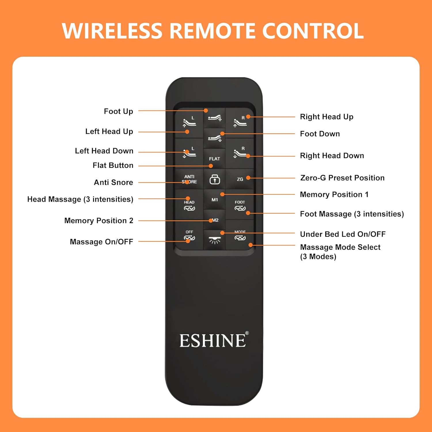 Dual-Zone Adjustment with Massage: Independent head and foot elevation for each side with separate remotes—ideal for partners with different sleep styles.